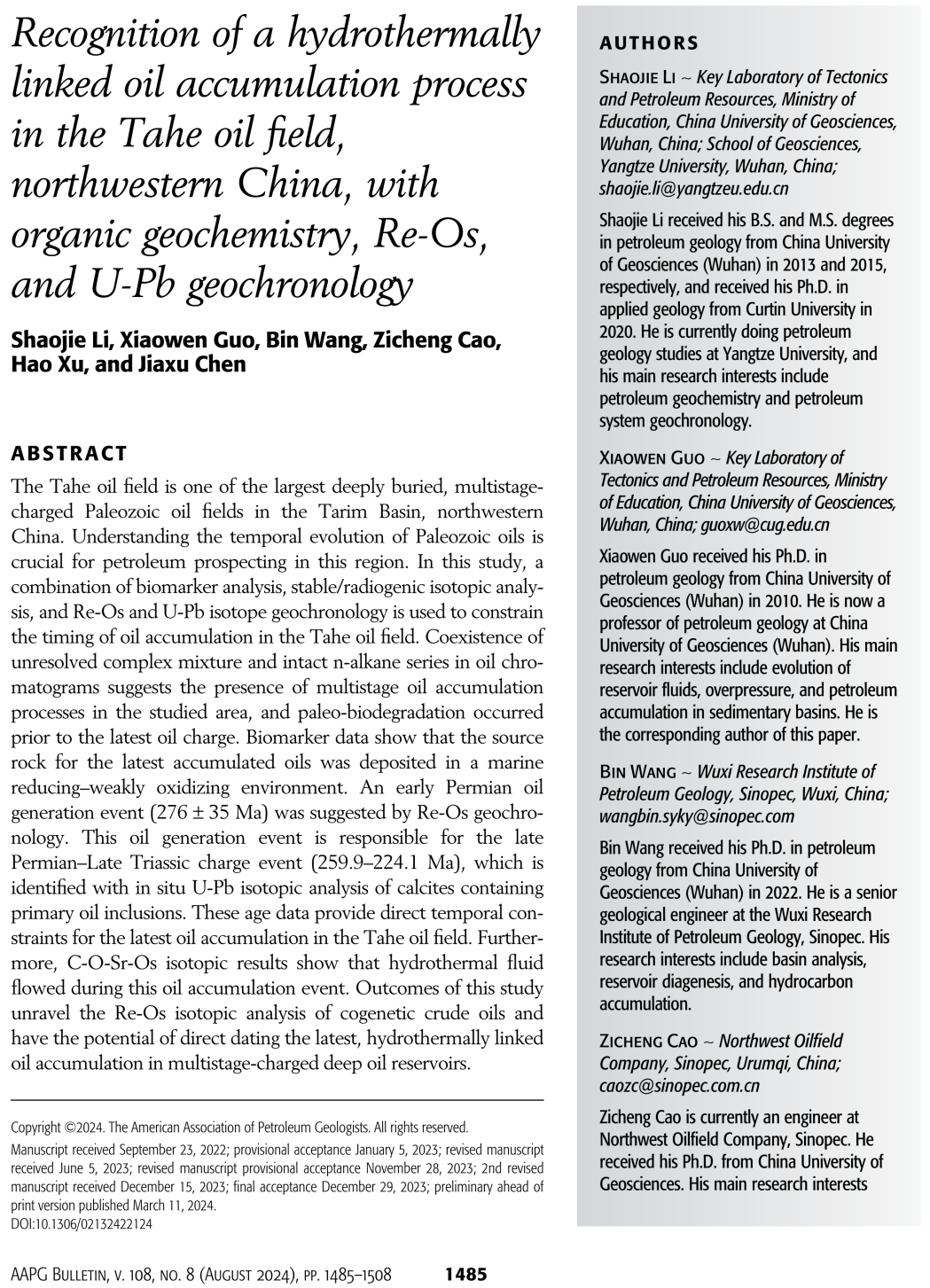 天游线路检测中心石油系李劭杰博士在石油地质学领域主流期刊《AAPG Bulletin》上发表题为“Recognition of a hydrothermallylinked oil accumulation processin the Tahe oil field,northwestern China, withorganic geochemistry, Re-Os,and U-Pb geochronology”的研究论文。