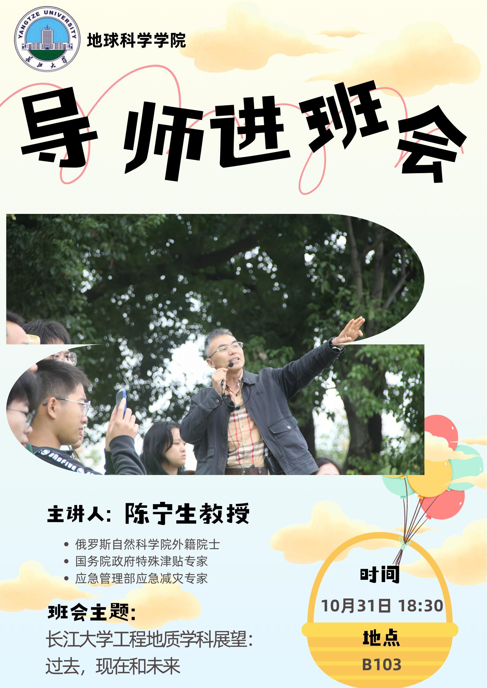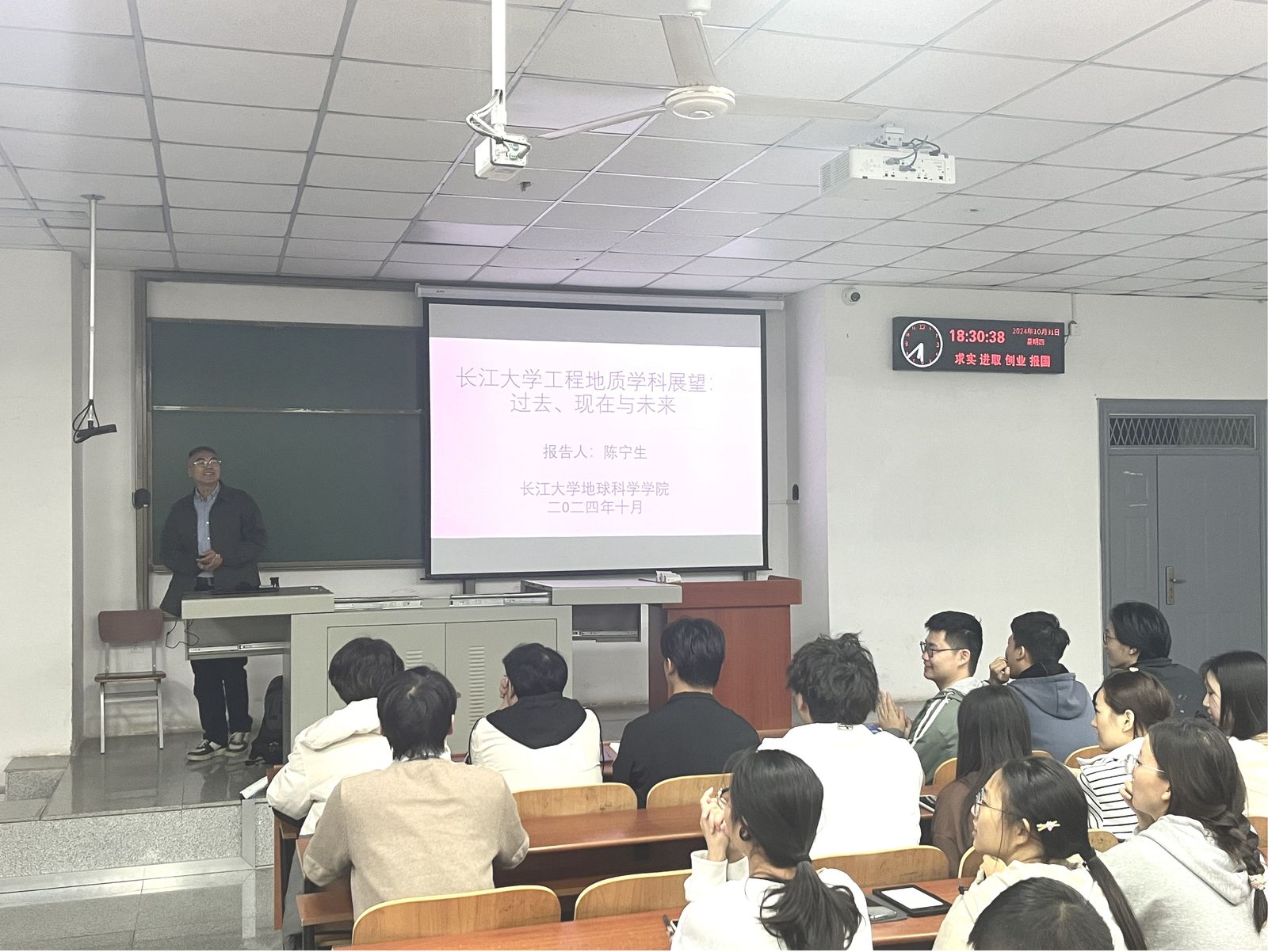 (通讯员 郭霖 党宇烁 李永健)为提高学生专业学习兴趣,帮助学生了解学科动态,助推天游官网学风建设,10月31日晚天游官网陈宁生教授做客“导师进班会”系列活动,在武教B103教室开展了题为“天游8线路注册检测中心工程地质学科展望——过去、现在和未来”的主题班会。陈教授团队教师、22和23级地质系全体本科生参会,现场掌声雷动,气氛热烈。