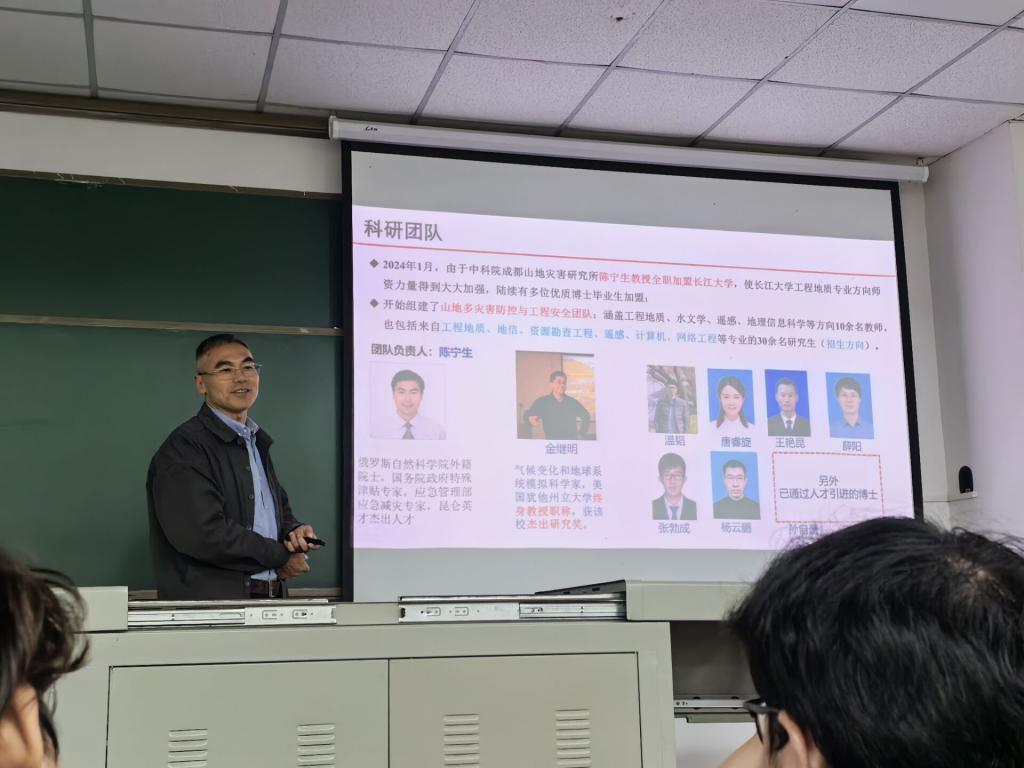 一流学科阶段是陈教授对天游官网工程地质学科的未来展望。陈教授说:“我们总体上有三个目标:一是总体上支撑实现习近平总书记提出的防灾减灾三个转变;二是理论上每年发表1-2篇顶级刊物论文;三是技术上实现多灾害预测预警的智能化。”随后,陈教授向大家展示了目前所取得的研究成果以及团队得天独厚的办公条件和技术先进的实验室条件。接着,陈老师为大家讲述了团队的研究生人才培养策略“四会”——会看、会写、会做、会想。