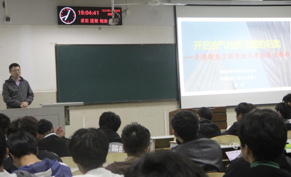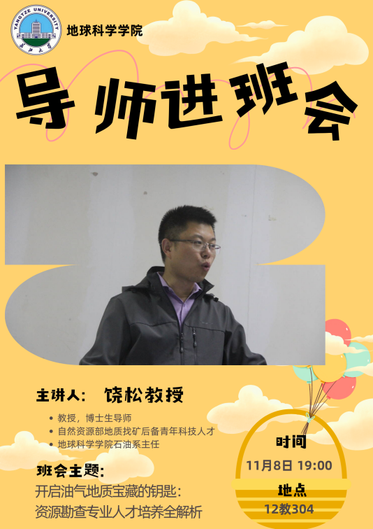 (通讯员 周文豪)为激发学生专业探索热情,助力学生知晓前沿资讯,促进天游官网学术繁荣。11月8日晚,天游官网石油系系主任饶松教授做客“导师进班会”系列活动,以“开启油气地质宝藏的钥匙”为主题在东校区12教304开展了精彩的主题班会,饶松教授、24级石油系全体本科生参会。