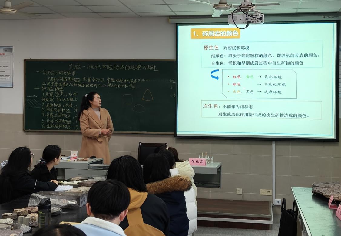 郭晋威老师以《岩浆岩和变质岩的鉴定要点》为例,讲述手标本描述的核心要素,带领同学们观察不同矿物颜色、速率和颗粒大小,归纳岩石的特征,生动讲解了常见岩浆岩与变质岩的鉴定技巧。