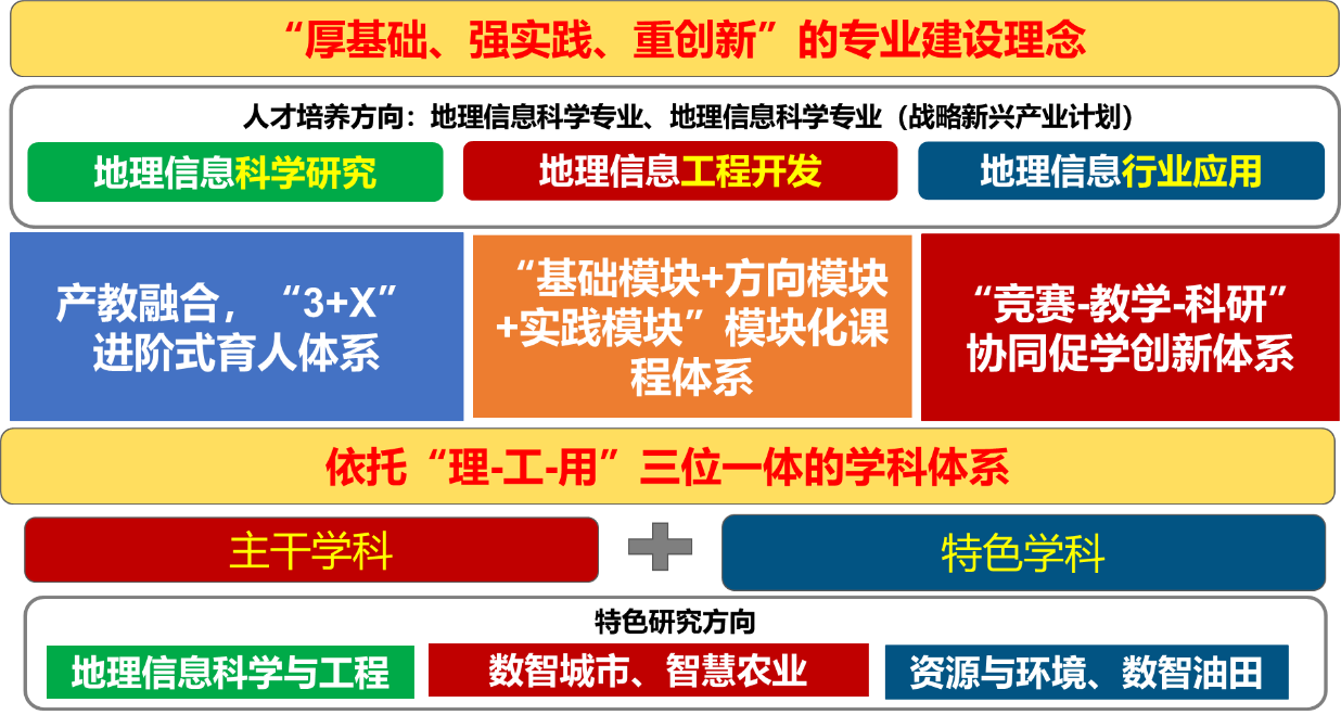 形成了“基础模块+方向模块+实践模块”的模块化课程体系。基础模块涵盖学科专业基本理论与方法;方向模块设置GIS方法研究、GIS软件开发和GIS行业应用;实践模块通过校企共建实验室,强化工程能力培养。建成并线上开放了“地图学原理及应用”(学堂在线)省级一流课程;跨学科整合优质资源,面向高年级学生开设“沉积岩石学”(国家级一流课程)、“遥感地学应用”等交叉学科课程,依托学校测绘、遥感、地质、石油、农学等优势学科,培养“GIS+能源”、“GIS+环境”等复合型人才,拓宽了毕业生的就业领域。