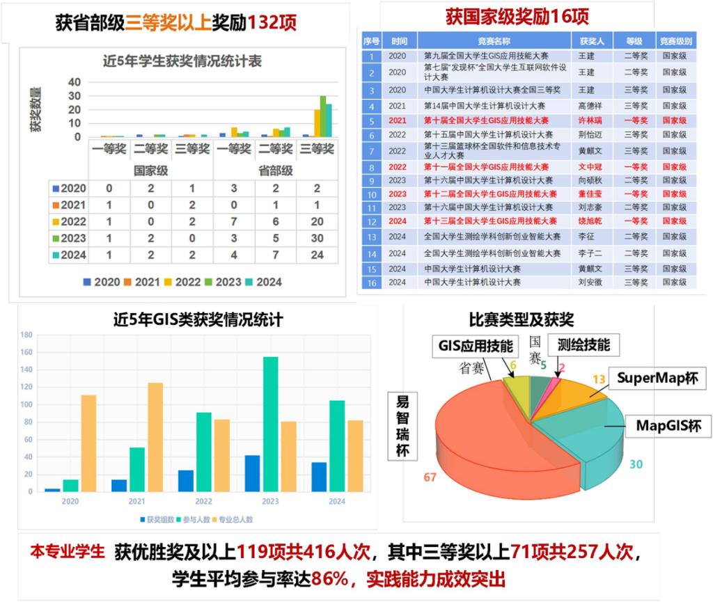 打造了“竞赛-教学-科研”协同促学创新体系。通过全国GIS技能大赛、创新创业大赛、大学生创新创业项目等平台,构建多层次学科竞赛组织体系;结合导师组助学促学创新机制,本科生加入导师课题组开展科研实践,实现“竞赛-教学-科研”良性循环。近5年学生参与学科竞赛获省级以上奖项130余项,2021-2024期间我校学生连续四年荣获“全国大学生GIS应用技能竞赛一等奖”;张跃、黄麒文等多名本科生发表SCI一区Top论文。