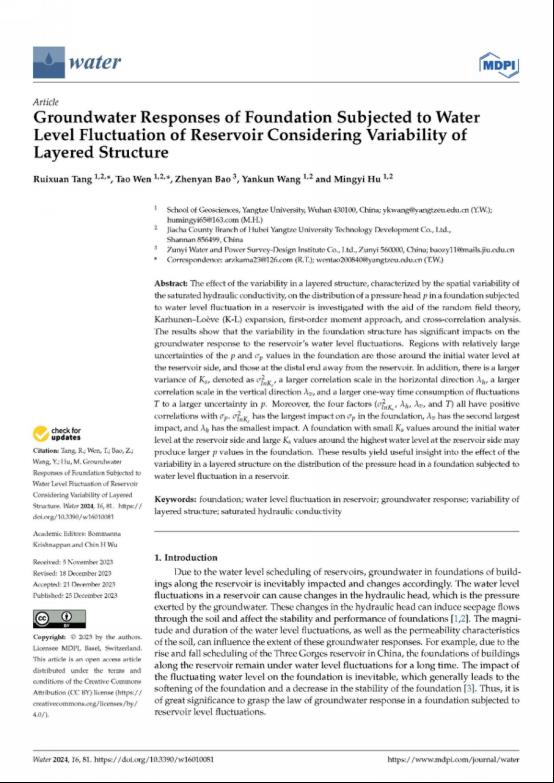 天游线路检测中心教师唐睿旋在《WATER》上发表题为“Groundwater Responses of Foundation Subjected to Water Level Fluctuation of Reservoir Considering Variability of Layered Structure”的研究论文。该研究运用了随机场理论、Karhunen–Loève (K-L)展开、一级矩法及相关分析等先进方法,深入探讨了基础在水库水位波动作用下,分层结构变化对地下水响应的影响。