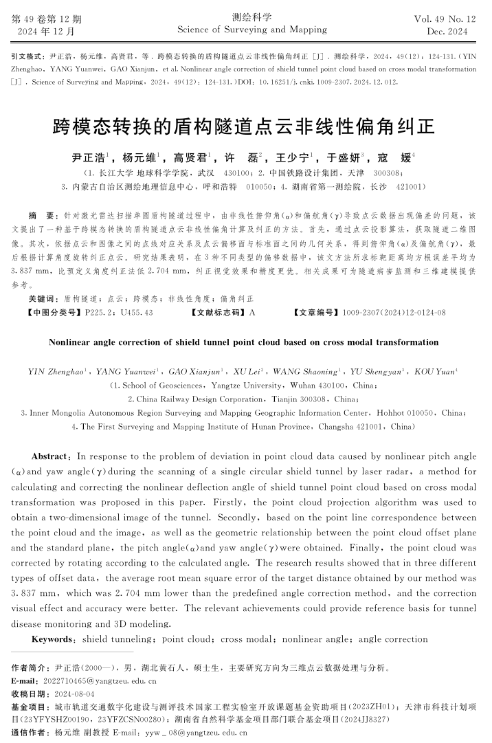 天游线路检测中心研究生尹正浩以第一作者身份在北大核心期刊《测绘科学》上发表题为“跨模态转换的盾构隧道点云非线性偏角纠正”的研究论文,天游线路检测中心为论文第一署名单位,研究生尹正浩为第一作者,副教授杨元维为论文通讯作者。