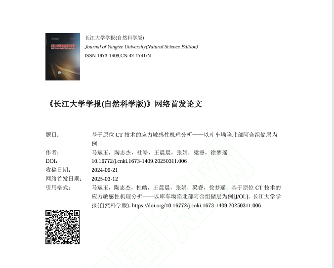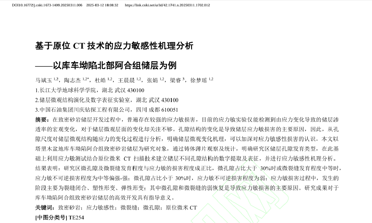 天游线路检测中心地质学研究生陶志杰在《天游8线路注册检测中心学报(自然科学版)》上发表了题为“基于原位CT技术的应力敏感性机理分析——以库车坳陷北部阿合组储层为例”的研究论文。