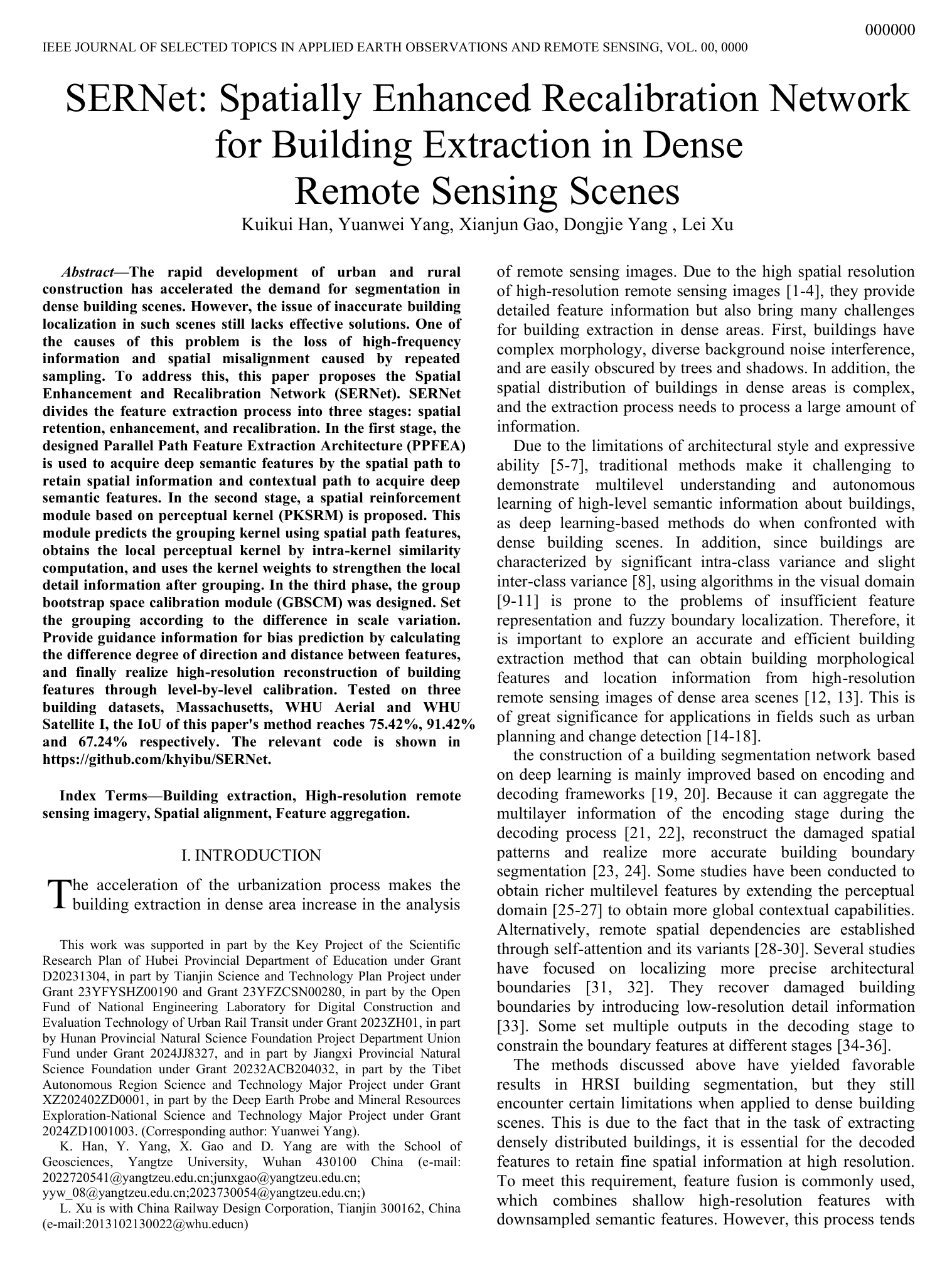 天游线路检测中心研究生韩奎奎以第一作者身份在SCI二区期刊《IEEE Journal of Selected Topics in Applied Earth Observations and Remote Sensing》上发表题为“SERNet: Spatially Enhanced Recalibration Network for Building Extraction in Dense Remote Sensing Scenes”的研究论文,其中天游线路检测中心为论文第一署名单位,研究生韩奎奎为第一作者,副教授杨元维为论文通讯作者。